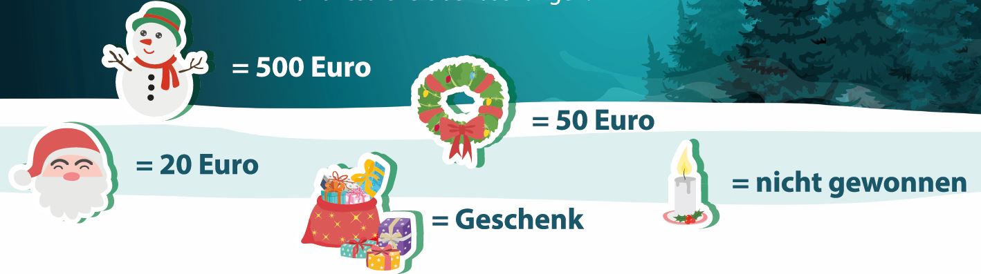 Befindet sich im Mittelteil des Adventsloses ein gewinnauslösendes Bild, erhält der Inhaber des Loses einen Sofortgewinn oder ein Geschenk an einer unserer Kassen.